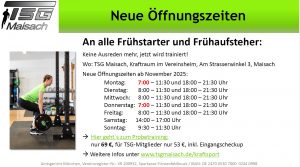 Sport, das ist das Kerngeschäft eines Sportvereins. Die TSG Maisach ist hier mit Sportangeboten für alle Altersstufen vertreten. Von den Einjährigen im Eltern-Kind-Turnen bis zu den 97-jährigen im Seniorensport. All die vielen Stunden müssen von unseren Trainerinnen und Trainern vorbereitet und gehalten werden. Ob im Kraftraum, in der Turnhalle, im Gymnastikraum oder auf dem Vereinsgelände. Eine großartige Leistung über viele Jahre: treu kommt ihr und leitet unsere Mitglieder beim Sport an. Zeigt Ihnen Übungen, verbessert die Haltung und Kondition und steigert damit das Wohlbefinden der Teilnehmer – Vielen Dank an alle Trainerinnen und Trainer. Und auch vielen Dank an alle Abteilungsleiterinnen und Abteilungsleiter – ihr haltet alles am laufen, ehrenamtlich und ohne Entlohnung!