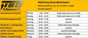 Sport, das ist das Kerngeschäft eines Sportvereins. Die TSG Maisach ist hier mit Sportangeboten für alle Altersstufen vertreten. Von den Einjährigen im Eltern-Kind-Turnen bis zu den 97-jährigen im Seniorensport. All die vielen Stunden müssen von unseren Trainerinnen und Trainern vorbereitet und gehalten werden. Ob im Kraftraum, in der Turnhalle, im Gymnastikraum oder auf dem Vereinsgelände. Eine großartige Leistung über viele Jahre: treu kommt ihr und leitet unsere Mitglieder beim Sport an. Zeigt Ihnen Übungen, verbessert die Haltung und Kondition und steigert damit das Wohlbefinden der Teilnehmer – Vielen Dank an alle Trainerinnen und Trainer. Und auch vielen Dank an alle Abteilungsleiterinnen und Abteilungsleiter – ihr haltet alles am laufen, ehrenamtlich und ohne Entlohnung!